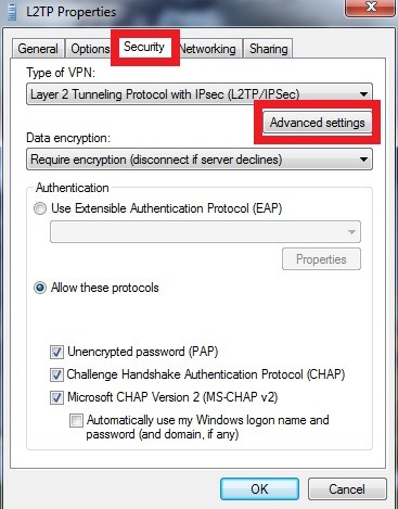 طبق عکس روی سربرگ security کلیک کرده و بعد از آن Advanced settings را انتخاب کنید.